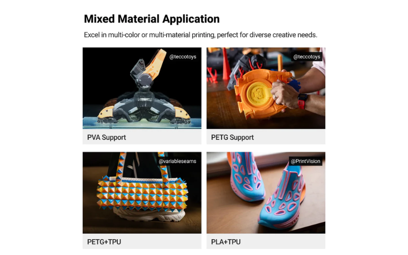 使用Snapmaker U1製作的多材料列印範例,包括PVA支撐材料、PETG支撐材料、PETG+TPU和PLA+TPU組合材料